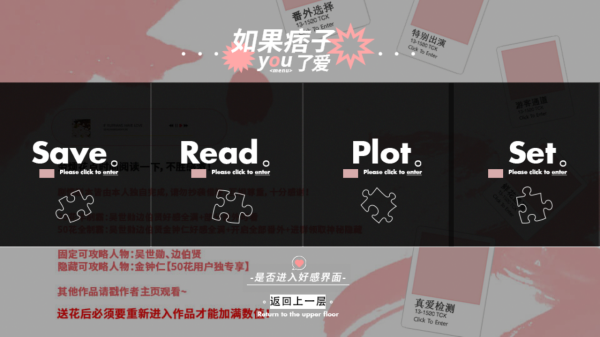 3、通过【Save】存档、【Read】读档,【Plot】推进剧情、【Set】调整设置,按提示探索好景界面,送花重进作品确保福利激活 。