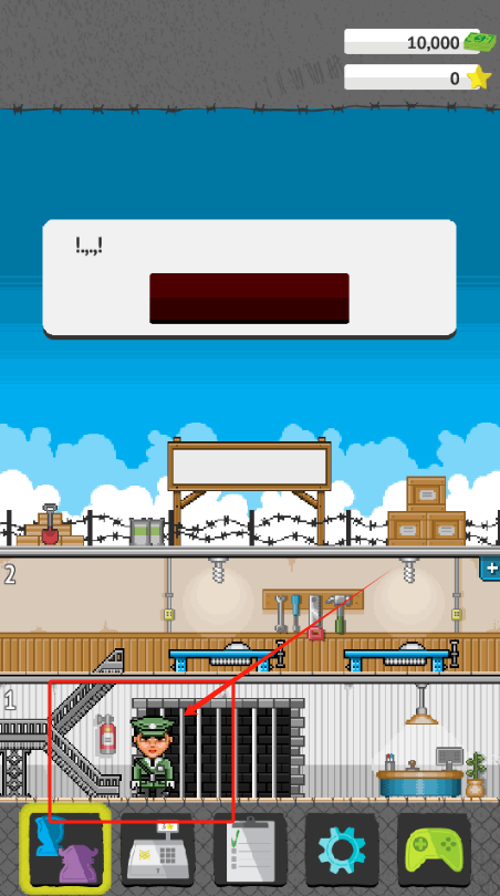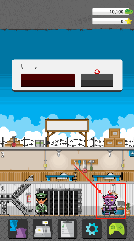 2、钱变成10100了,点收银机图标买新设备,紫色外星人是新囚犯。