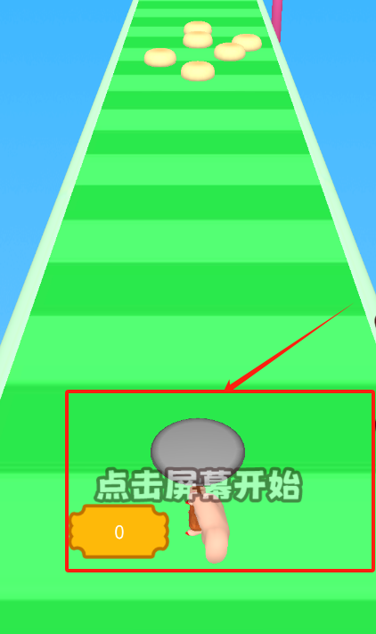 1、看到蓝色背景绿色跑道和点击屏幕开始提示,用手指点橙色框里的文字,就能开始跑酷游戏啦。