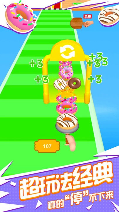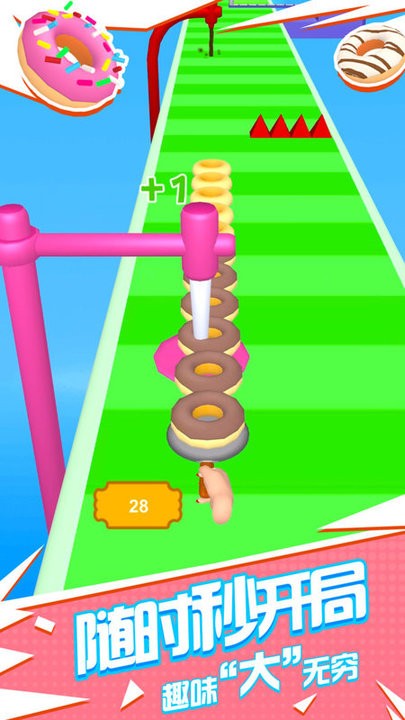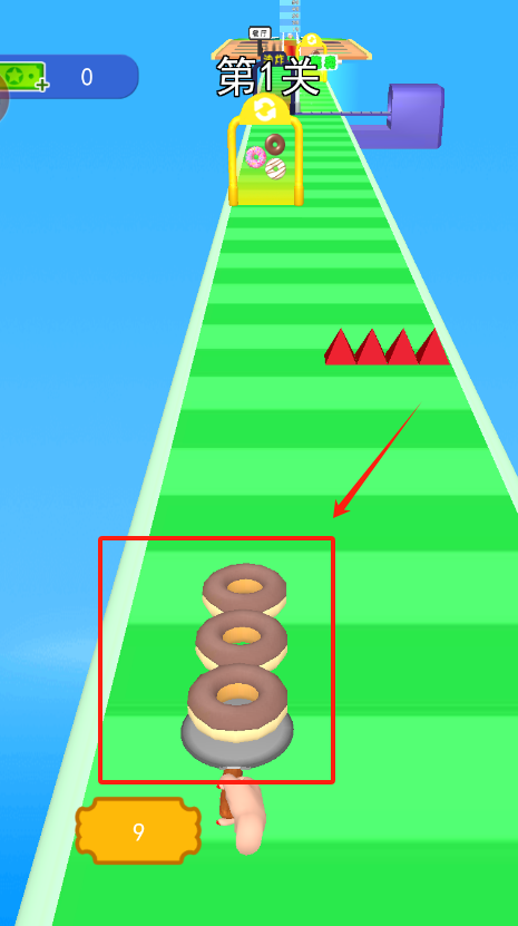 2、看到绿色跑道上的甜甜圈障碍物,直接点屏幕控制小人跳跃,躲开障碍物吃到金币往前冲。
