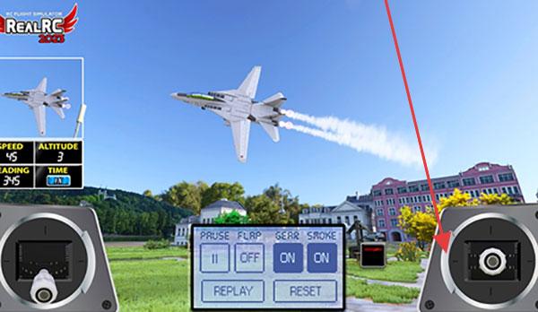 2、中图换喷气式战机,利用“FLAP(襟翼)”“GEAR(起落架)”“SMOKE(烟雾)”功能,在飞行中切换模式,适应高速飞行,注意场地。