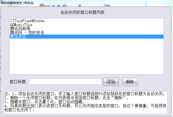 1、添加自动关闭的窗口:手工输入窗口标题或按F5添加鼠标处的窗口标题为自动关闭。