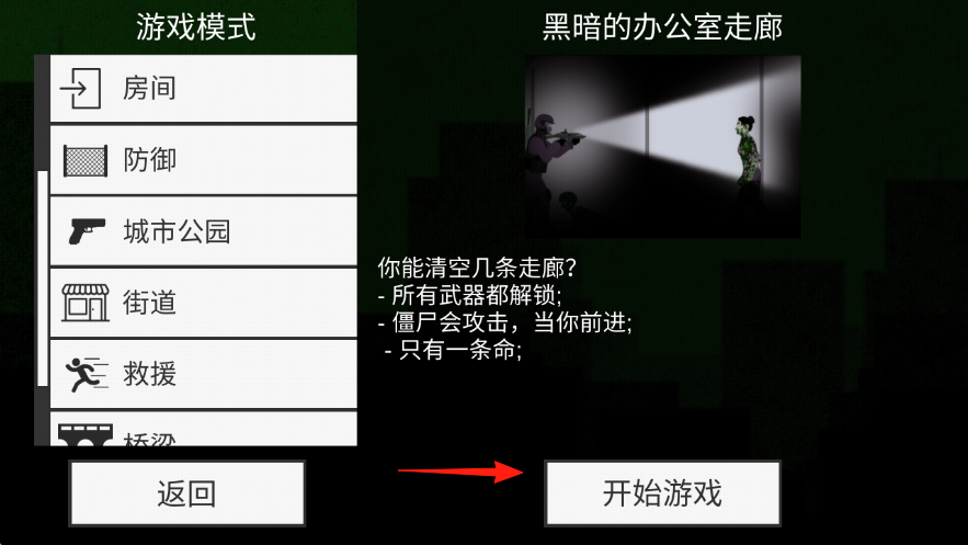 1、模式选择,选“黑暗的办公室走廊”,点【箭头】指向“开始游戏”,进入关卡。