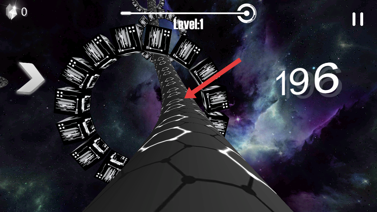 3、游戏中沿太空通道前行,躲避旋转障碍,留意上方进度与右侧分数,专注操控以突破Level1关卡。
