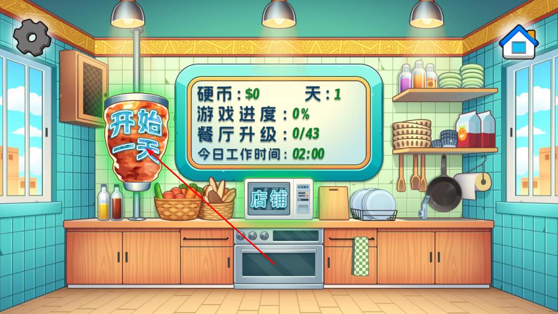 1、点击“进入店内”,开启经营,接待顾客,制作沙威玛,赚金币升级。