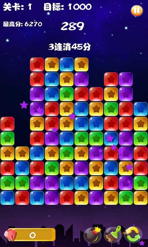 2、巧妙利用特殊星星与道具组合,通过精准操作最大化得分,收集隐藏星星激活全屏消除,预判关卡目标提前调整策略。