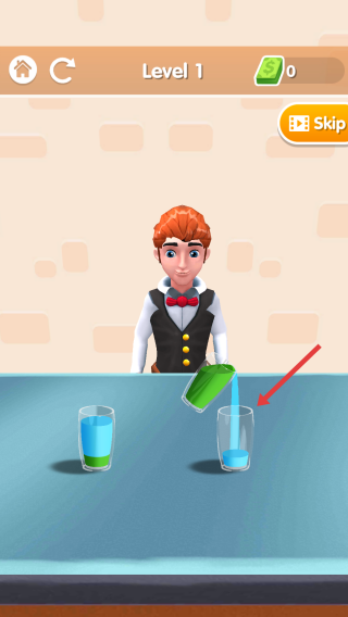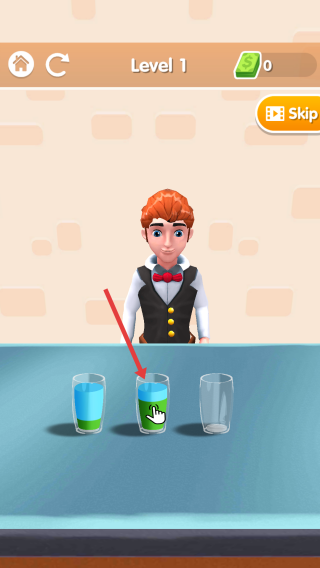 3、按规则完成液体调配(如让特定杯子呈现指定颜色、分层),达成Level1目标,解锁后续关卡,体验更多复杂调饮谜题。