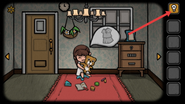 3、在房间场景中,观察女孩旁的物品与窗户处的【衣服提示】,点击右侧灯泡图标获取线索,互动道具推进解谜。