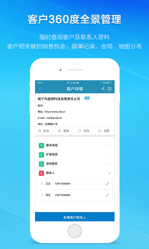 客户360度全景管理,随时查阅客户及联系人资料,客户相关联的销售机会、跟单记录、合同、地图分布