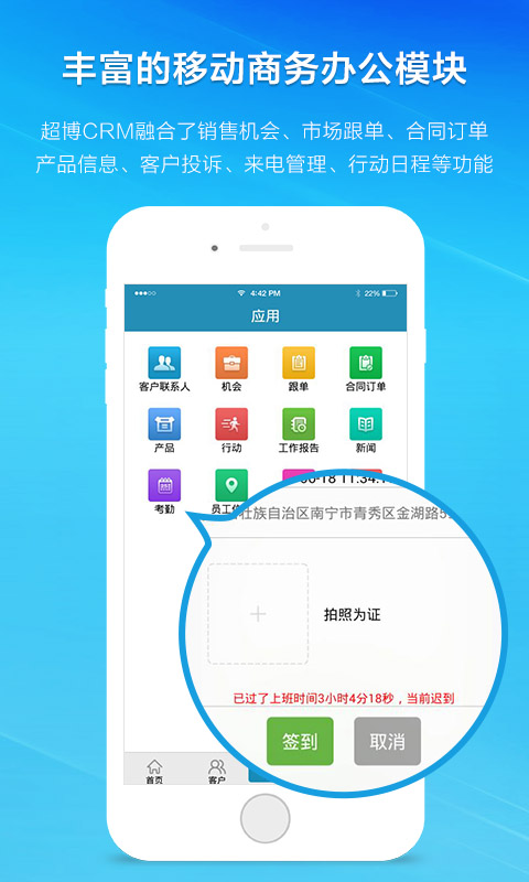 丰富的移动商务办公模块,超博CRM融合了销售机会、市场跟单、市场订单、合同订单、产品信息、客户投诉、来电管理、行动日常等功能