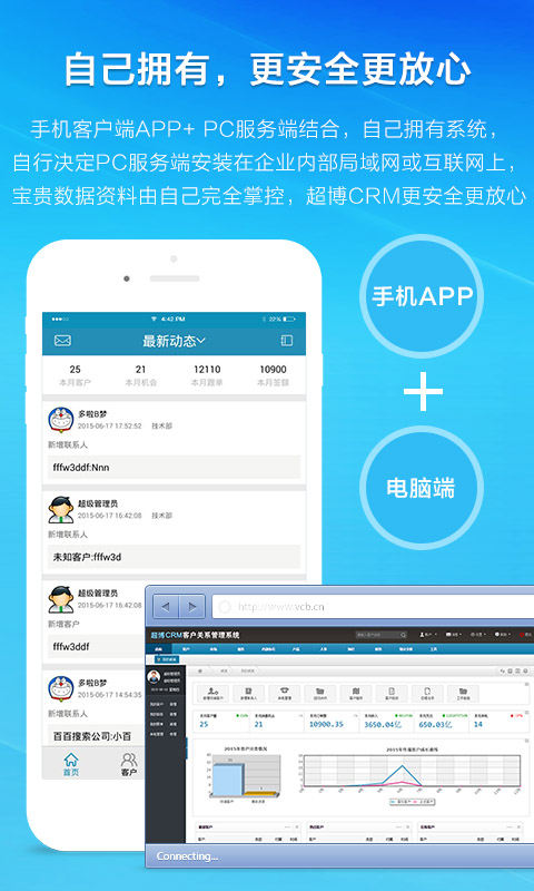 自己拥有,更加的安全放心,手机客户端加PC服务端结合,拥有自己的系统,更安全更放心