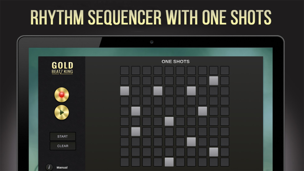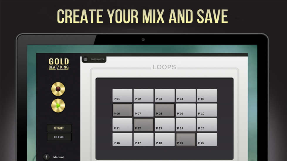 1、进入曲目列表界面,左侧金色按钮中,红色为录制键、绿色为播放键,点击P01-P20任意曲目方块,开始节奏循环创作。