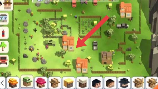 1、画面中展示了像素化的房屋、树木、车辆等建筑和场景元素,下方是建造或放置建筑的功能栏。