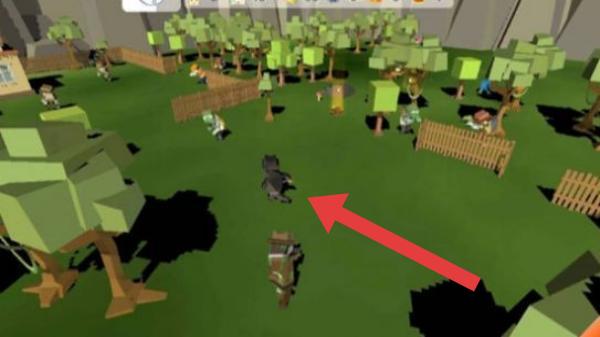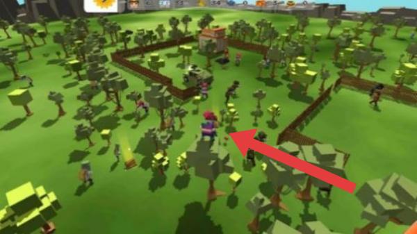 2、画面中有树木、栅栏、人物等元素,人物在一个开放场景中活动,是生存或冒险题材的游戏。
