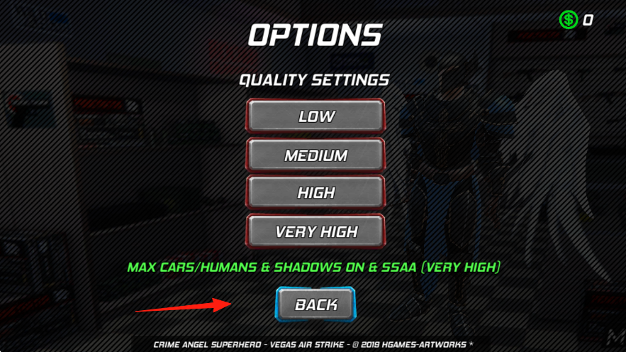 1、设置调整“OPTIONS”界面,可选择画质(LOW到VERYHIGH),选好后点“BACK”返回游戏。