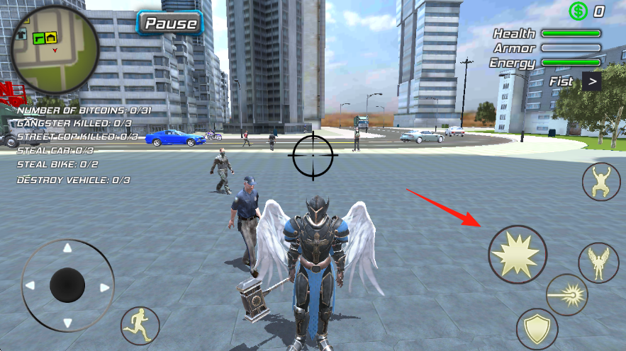 2、战斗操作进入城市场景,操控带翅膀、持锤的英雄,按箭头指引,点击右侧技能(如星形图标)攻击敌人(黑帮、警察等目标)。