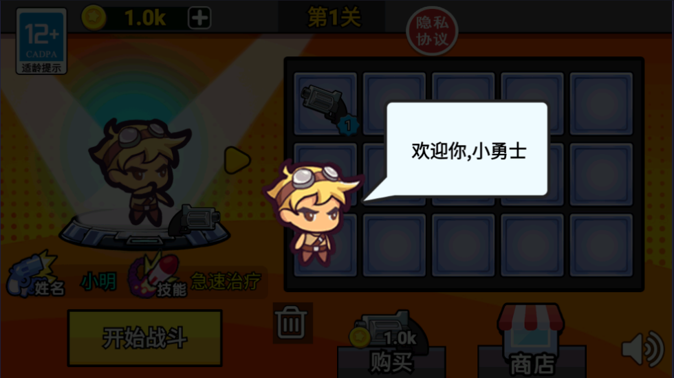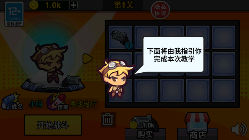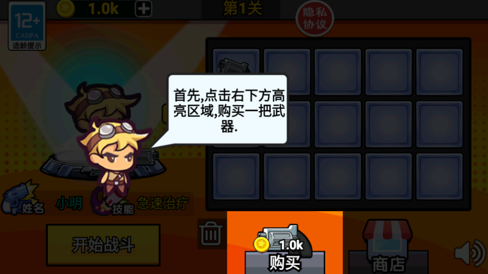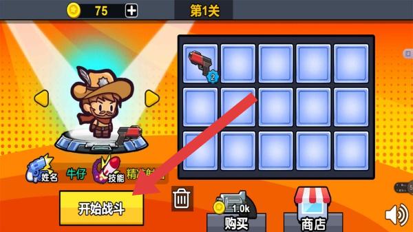 1、主界面点击“开始战斗”(箭头指向),进入第1关,操控牛仔角色,携带武器,准备迎战敌人。