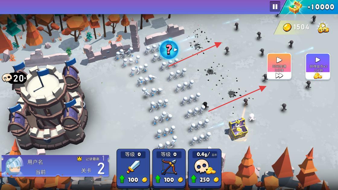 2、消耗金币“升级兵种”(剑、弓、骷髅),提升战力,应对关卡敌人(黑色火柴人)。