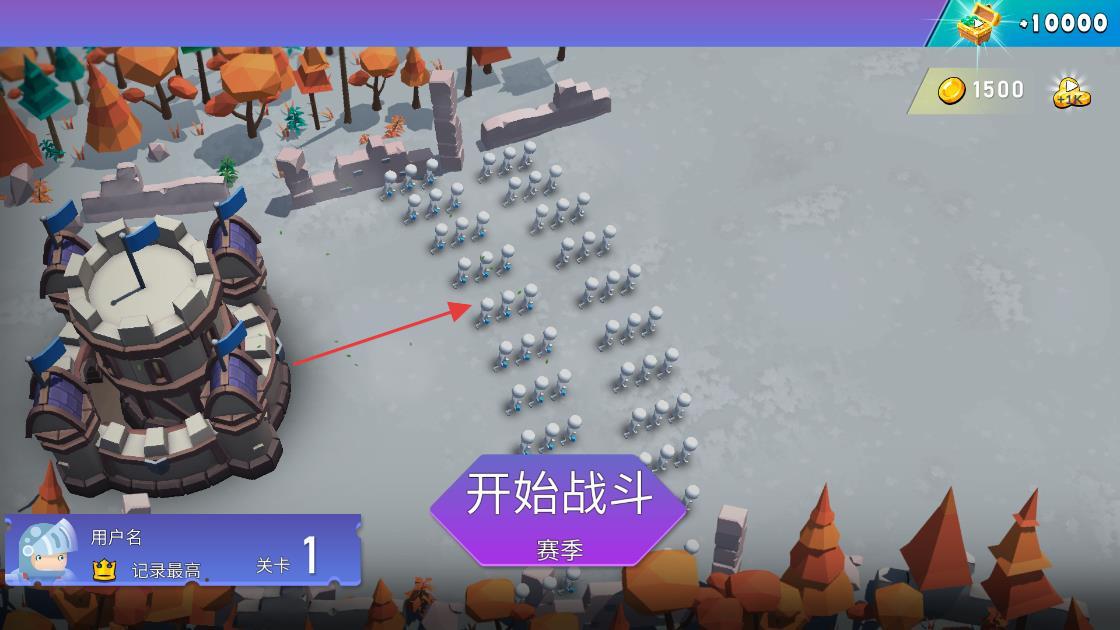 1、“组建军团”,在城堡外布置火柴人士兵,搭配剑兵、弓兵等兵种,准备出征。