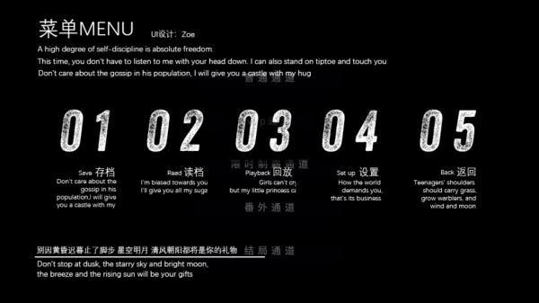 3、菜单页可操作【存档】【读档】【回放】【设置】【返回】,借功能管理进度、调整体验,通过对应通道探索剧情内容。