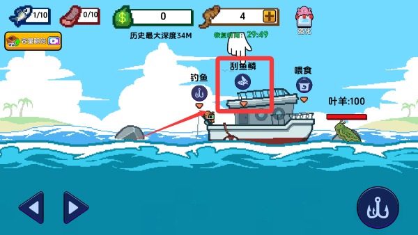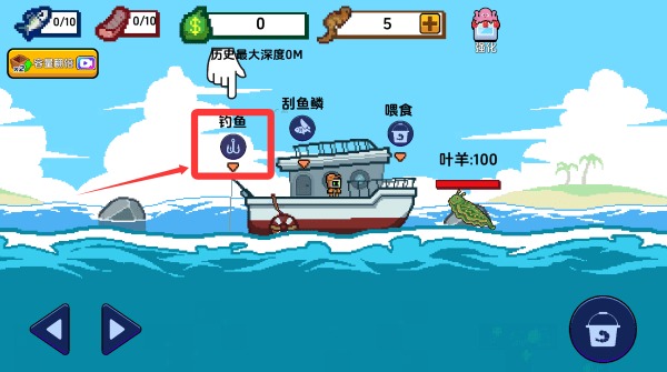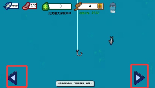 2、切到钓鱼界面,你可以左右移动鱼钩,下降的越深,鱼越大。