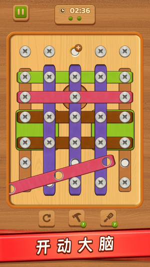 1、核心目标为清空场景中的所有螺丝。通过点击选中目标螺丝,滑动屏幕旋转方向,将其对准空置孔位后下滑移除,类似拼图与华容道的结合玩法。