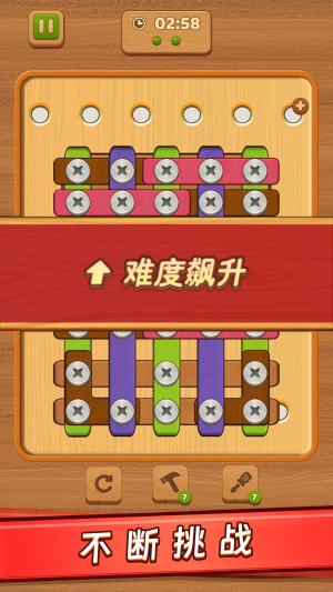 1、动态难度曲线适配不同玩家水平。前20关侧重基础操作教学,后续逐步引入多层螺丝嵌套、旋转机关等机制,确保挑战性与成就感平衡。