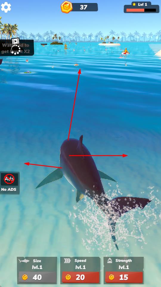 1、操控鲨鱼在海域游动,追捕、吞噬小鱼,积累金币,完成目标提升等级,逐步解锁更大猎物。