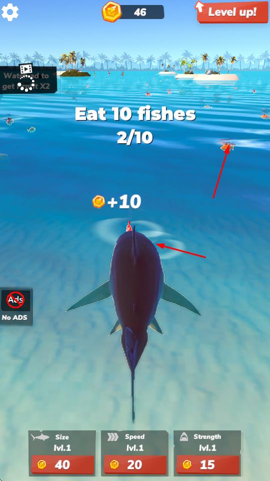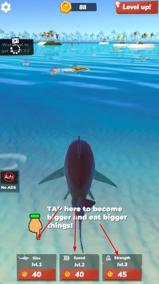 3、通过吞噬、升级,解锁“Levelup”进化,从弱小鲨鱼成长为海洋霸主,挑战更大生物。