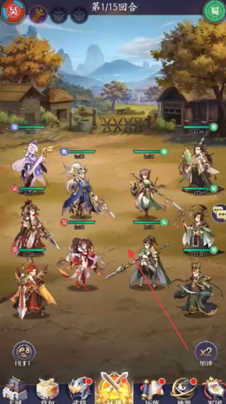3、战斗时,观察敌方阵容,调整己方武将站位(箭头指向),利用武将技能、阵营克制,合理释放大招,争取胜利。