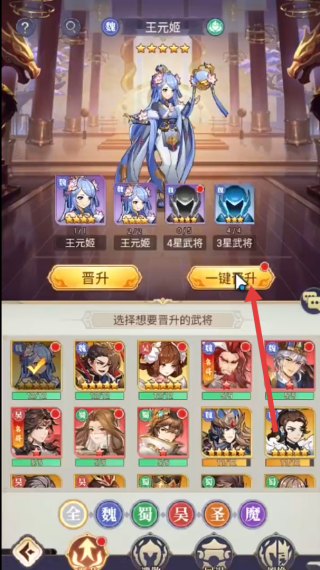2、进入武将晋升界面,点击【一键晋升】,自动消耗材料提升武将星级,增强战力,优化阵容。