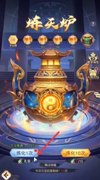 1、在“炼天炉”界面,点击【炼化1次】(箭头指向),消耗道具抽取武将、资源,积累幸运值,解锁奖励。
