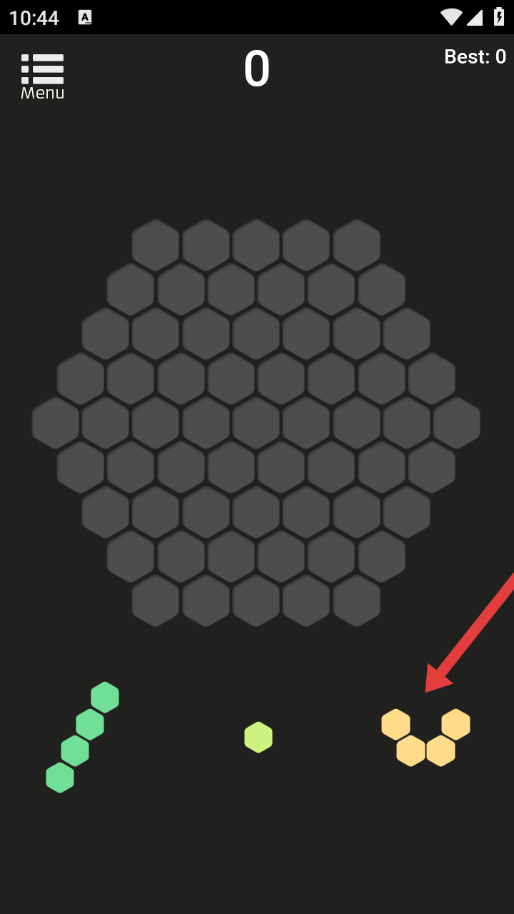 1、进入游戏,拖拽底部三种形状的色块(绿条、黄点、橙簇)到上方六边形网格,合理规划位置,开启消除挑战。