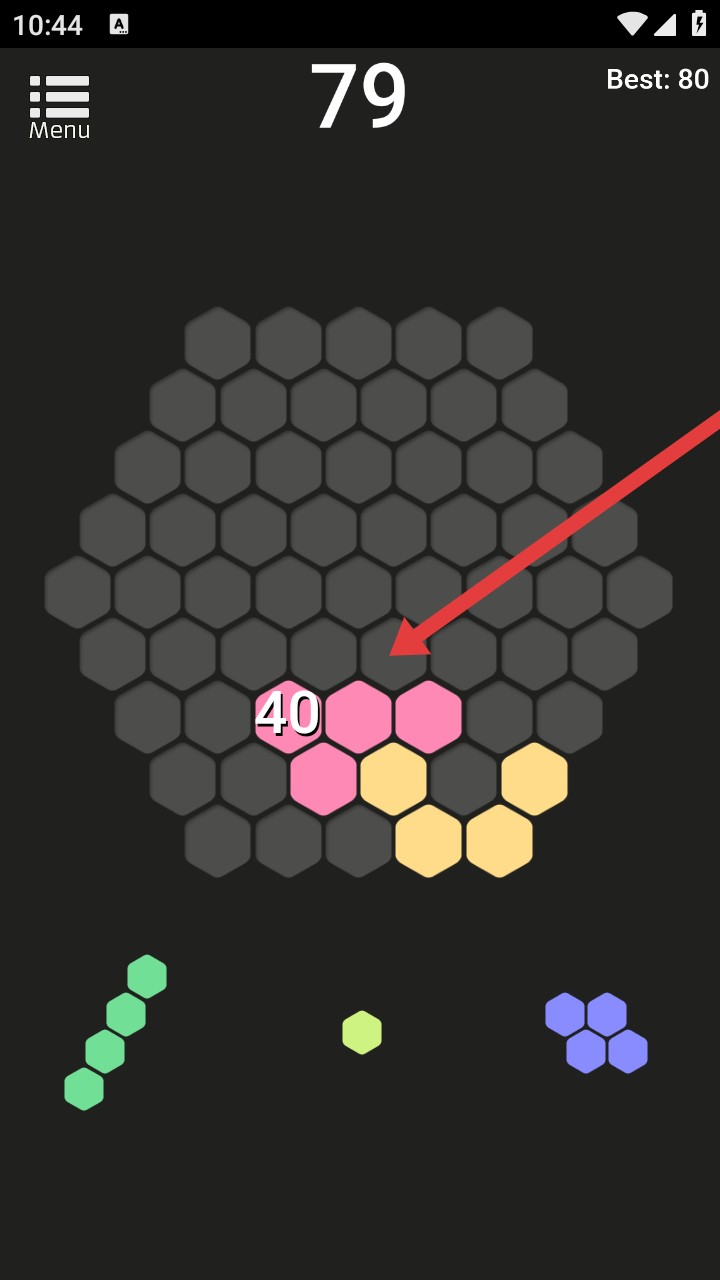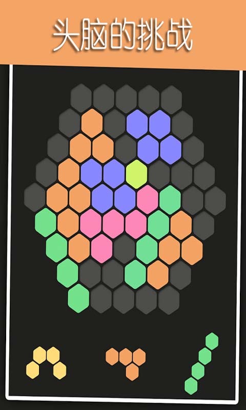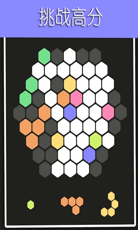 1、填格自动消除:在六边形格子中放置方块,任意方向的格子被填充满即自动消除并得分,消除数量越多得分越高,通过持续消除积累分数,体验快速得分的满足感。