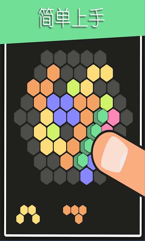 1、轻松策略易上:作为轻松休闲策略作品,无需复杂学习即可快速投入,核心围绕六角形方块的堆放与消除展开,策略性体现在选择图案与位置上,能享受休闲时光。
