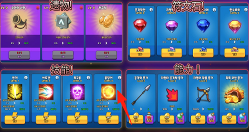 3、在技能界面,解锁箭头标记的技能,【搭配遗物、符文石】,增强角色战斗能力。