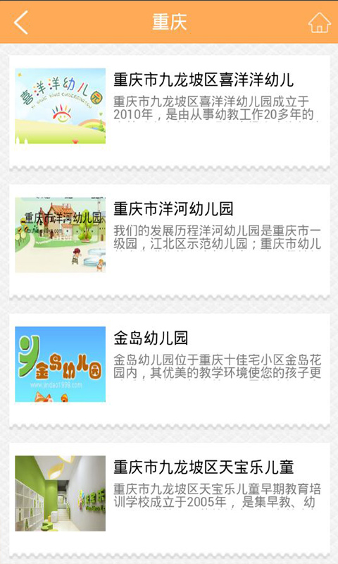 重庆幼教网app是一款为重庆地区打造的幼儿资讯服务,在这里你可以轻松的了解到各类幼儿园的特点和附近的各类学习班,还有着许多的育儿知识可以了解,让你可以更好的对孩子进行教育工作