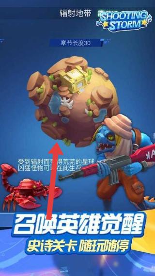 3、在“辐射地带”关卡,按箭头探索荒芜星球,击败凶猛怪物,推进“英雄觉醒”剧情,完成挑战。