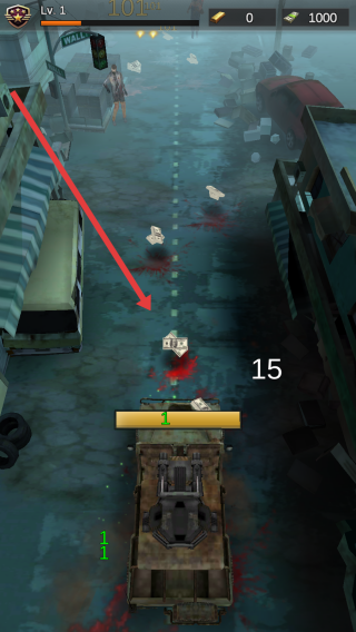 2、移动阶段,沿箭头指引方向,驾驶载具或徒步前进,拾取道路上的物资(如纸张、金币),避开僵尸群。