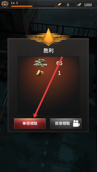 3、胜利结算后,点击“单倍领取”(箭头指向),获取金币、金条奖励,继续下一关挑战。