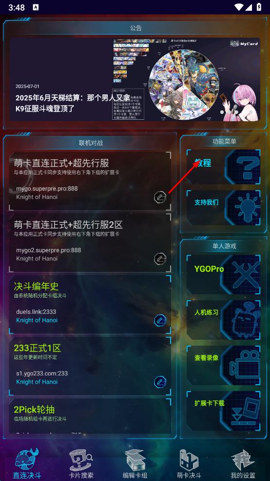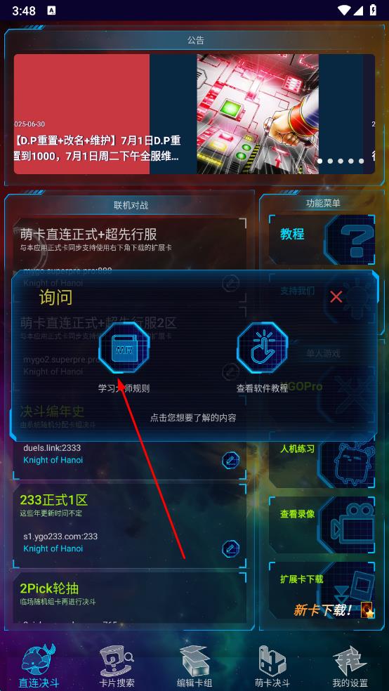 3、切换至联机模式与其他玩家实时对战,利用自定义卡牌编辑功能调整卡组构筑,在排位赛中运用策略击败对手,提升决斗者段位。