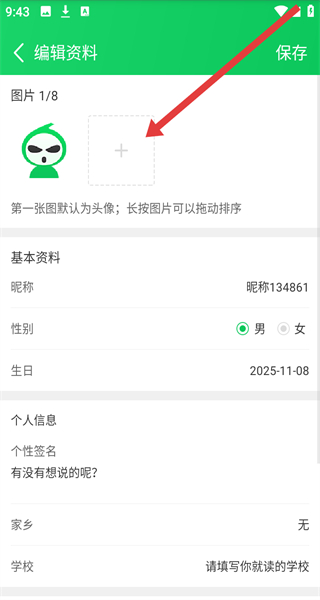 4、在编辑资料页面中,可以点击图片右侧+按钮,进行添加图片作为头像进行更换。