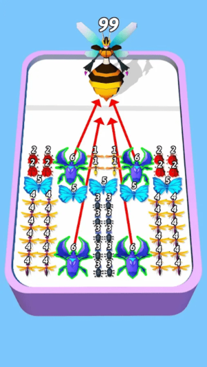1、玩家需要通过滑动屏幕合并相同昆虫,逐步培养出强大的战斗单位,在战场上对抗敌人。