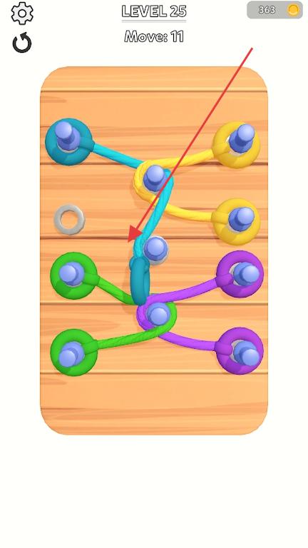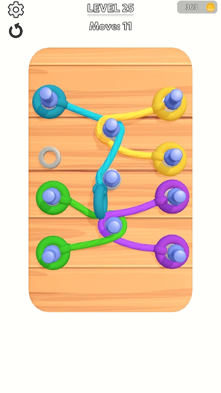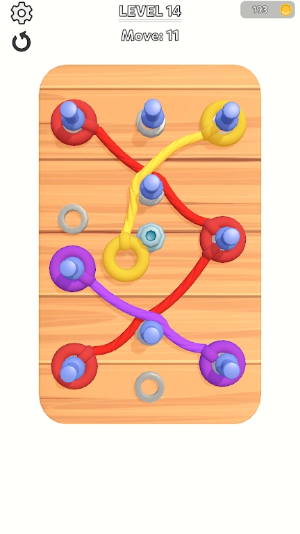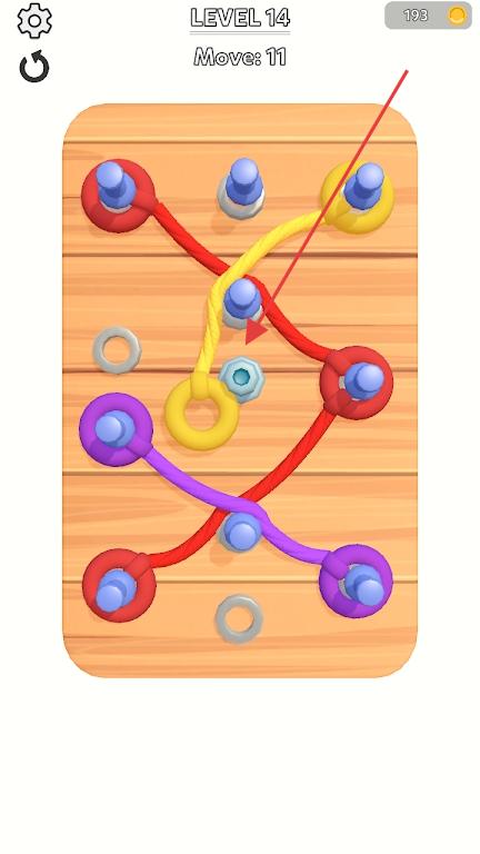 3、挑战高难度关卡,应对需要精准计算绳索长度、多步联动的解密设计,凭借对绳索与销钉互动规律的掌握,完成复杂谜题,解锁隐藏关卡和特殊绳索皮肤。