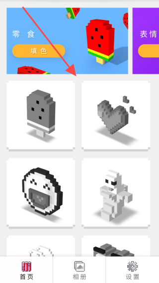 1、在游戏首页,选择一个像素图案,如零食分类下的图案,点击进入填色环节,开启创作之旅。