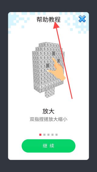 2、初次接触游戏时,认真查看【帮助教程】,了解如双指捏搓放大缩小等操作技巧,便于后续精准填色。