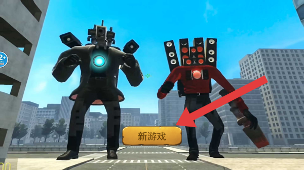 1、界面中有两个造型奇特的机器人角色,画面中有一个【新游戏】按钮,点击方可进入,可开启新游戏进程的动作类。