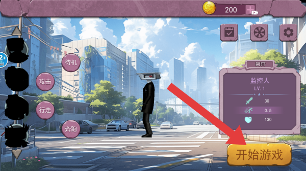 2、画面中有个头顶监控设备的无脸角色,界面有“待机”“攻击”“行走”“奔跑”等操作按钮,点击【开始游戏】按钮,右侧显示角色信息“监控人LV.1”。