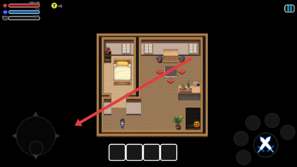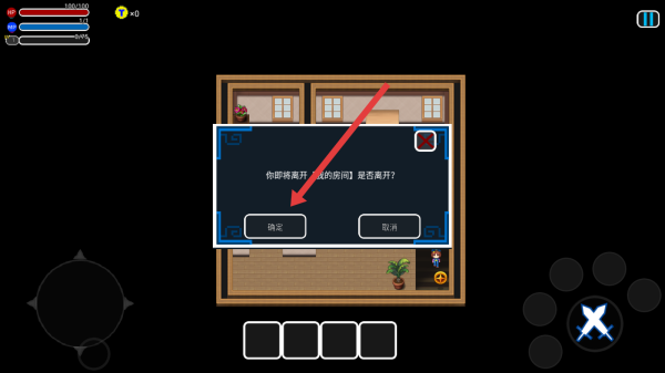 1、操控角色,移动至房间出口(箭头指向),触发离开房间提示,准备探索外部世界。