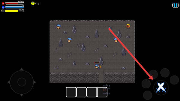 3、野外场景遇敌人,点击箭头指向的攻击按钮,发动攻击,击败怪物,获取经验、道具。